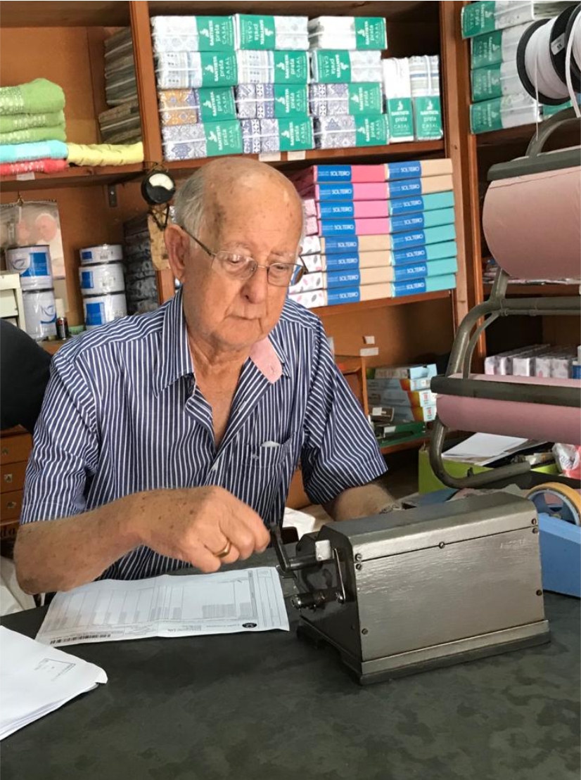 Sr. Aristeu começou a trabalhar com 15 anos, no armazém do irmão, em São Domingos da Bocaina. Em 1952, o irmão morreu, ele paralisou as atividades e, depois de um ano, recomeçou sozinho. Em 1957 mudou-se para Lima Duarte e fundou aqui o Armazém do Povo, que funcionou por muitos anos no casarão que deu lugar ao Banco do Brasil. Ali trabalhou por 17 anos, casou-se com a Professora Maria José, com quem teve três filhos: Vanize, Janice e César. Ali também recolhia cobras, que encaminhava ao Instituto Butantã e recebia o soro anti ofídico, para quem precisasse em Lima Duarte e região. Depois mudou o estabelecimento e o ramo de comércio para a loja no prédio da AALD, aonde funciona até hoje. O “Tecidos Janice” vendia tecidos, aviamentos, roupas de cama e banho. Todas as novidades da moda, os limaduartinos podiam encontrar ali, como as famosas e saudosas marcas: Conga, Kichute, Havaianas, UStop, Alpargatas, Passo Doble e as primeiras calças jeans. Sr. Aristeu conta que viajava para fazer compras e recebia sempre a visita do revendedor José Alencar, que depois virou político. Ele tinha uma fábrica de tecidos em Ubá – MG, trazia a mercadoria e deixava em consignação. Quando Sr. Aristeu vendia, depositava os valores no Banco da Lavoura. “José Alencar me ajudou muito, pois confiou em mim, deixando as mercadorias. Assim pude crescer, sustentar a família, construir minha casa própria”, ressalta.