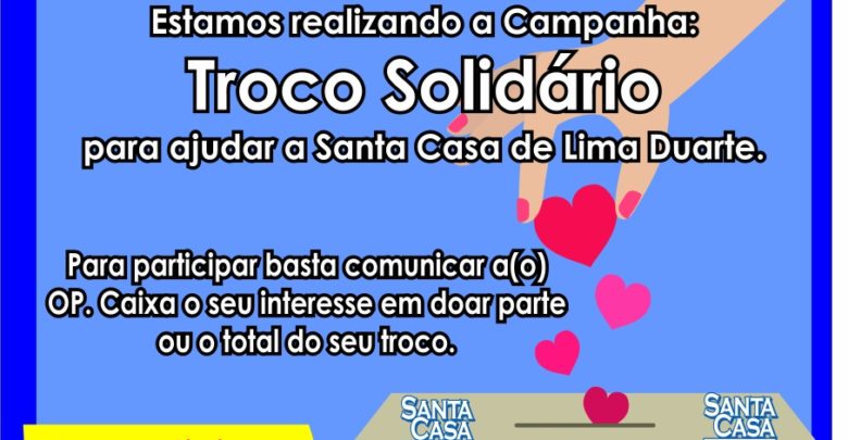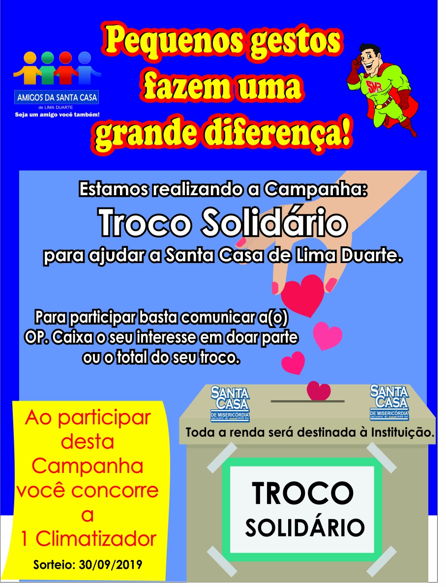 O Projeto Troco Solidário foi criado em 2018 em parceria com o Supermercado Ramos, empresa local de Lima Duarte com o objetivo de beneficiar a Santa Casa de Misericórdia de Lima Duarte. Ano passado foram arrecadados R$ 9.810,35 no período entre 25/04 até 26/06/2018. O valor foi completamente repassado ao Hospital e impulsionou aquisição de medicamentos e benefícios para a Instituição.