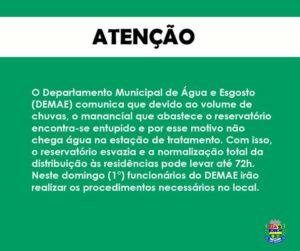O DEMAE informa aos usuários que devido às fortes chuvas que ocorreram ontem 29/02/2020, ocorreu um entupimento no manancial que abastece a cidade. A equipe do DEMAE ainda não pôde alcançar o local, pois a estrada está interditada e é um local de difícil acesso. Logo, solicitamos que economizem água o máximo que puderem, informem os vizinhos que não tem acesso às redes sociais, advirtam aqueles que estiverem gastando água desnecessariamente, pois quando o reparo for feito ainda leva até 72 horas para que o abastecimento seja normalizado. Agradecemos a compreensão e a colaboração de todos.
